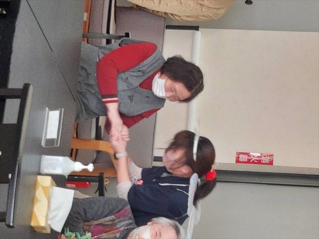 スタッフの「私に元気を分けてくれ~!」の後に、ご利用者様一人ずつ元気を分けてもらいます!